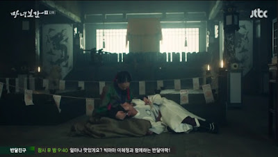 Meanwhile, at the palace, the Crown Prince's curse is also activated because Yeon hui is still alive. Hong joo feels it and her body weakens, letting her know that the princess is actually alive. The Crown Prince falls ill and the Queen asks Hong joo to cure him. But there's only one way to save the Crown Prince and it is to kill the princess, Yeon hui.